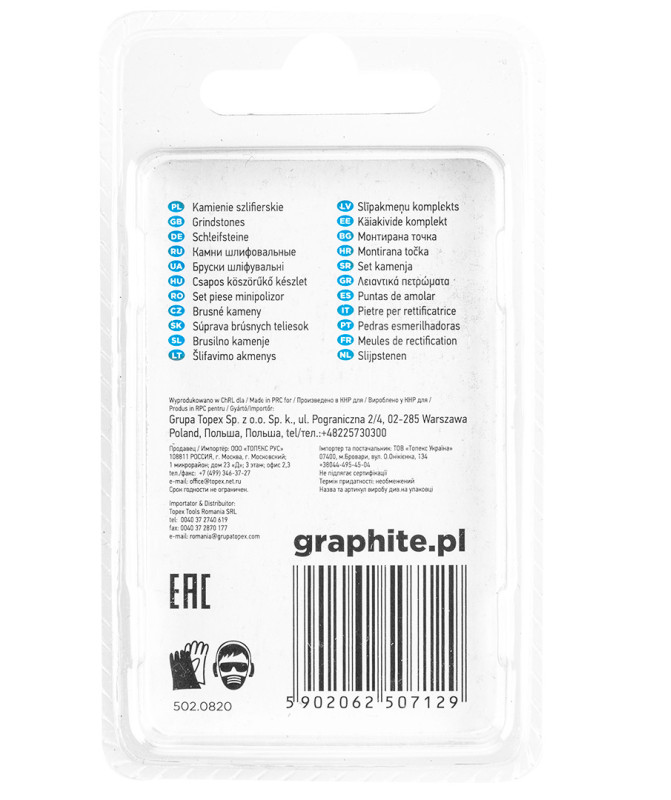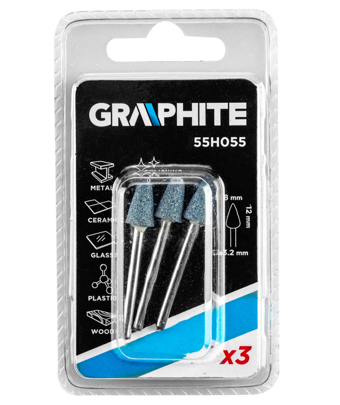 Kamień szlifierski GRAPHITE (nr kat. 55H055) w kształcie stożka o średnicy 8 mm i długości 12 mm. Zestaw zawiera 3 sztuki. Przeznaczone są do stosowania z miniszlifierką. Kamień szlifierski wykonany został z tlenku aluminium. Nadaje się do ostrzenia, wygładzania, usuwania zadziorów i ogólnego szlifowania większości materiałów. Można stosować je do obróbki: metali, odlewów, spoin spawanych, nitów, usuwania rdzy, ceramiki, szkła, drewna, plastiku.