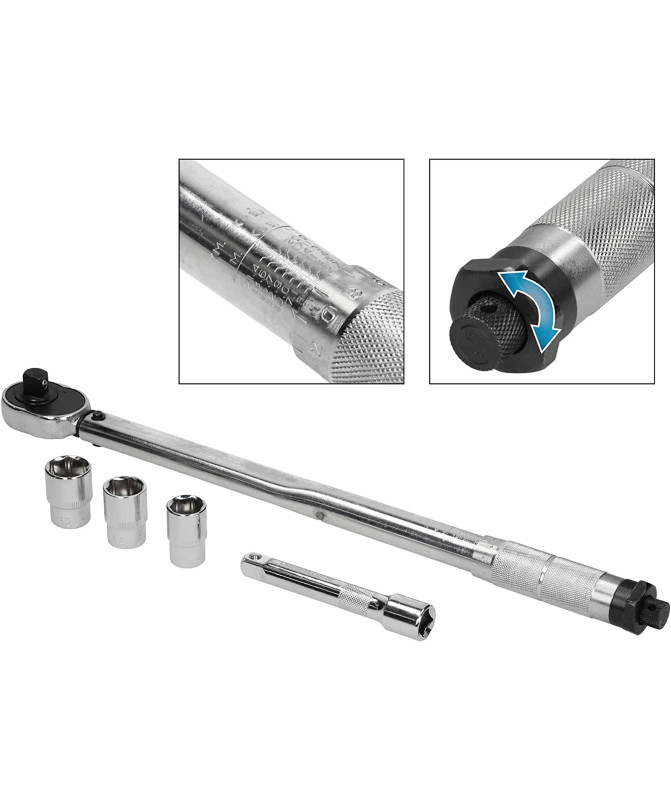 KLUCZ DYNAMOMETRYCZNY 1/2" 28-210 NM Z KOMPLETEM NASADEK 1/2" (17,19,21 MM) ORAZ PRZEDŁUŻKA 1/2" 125 MM