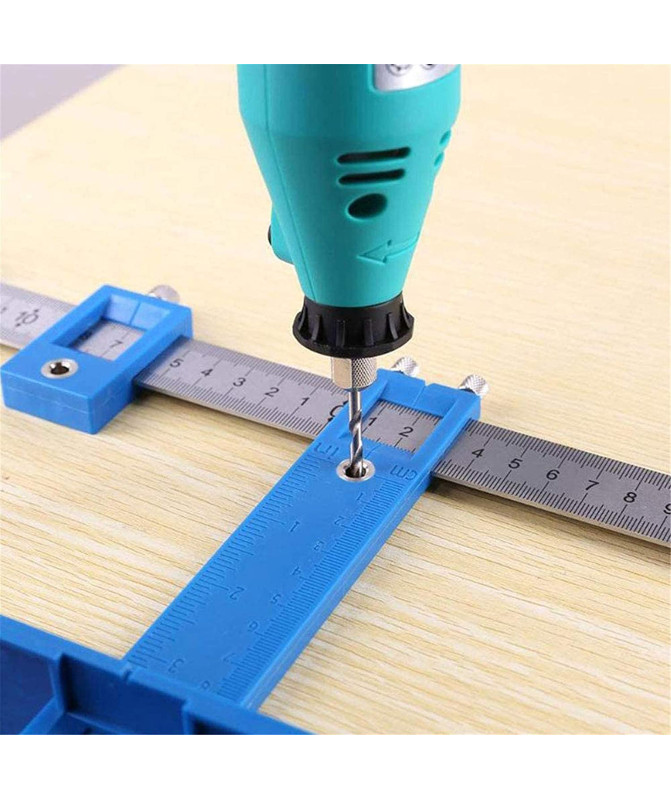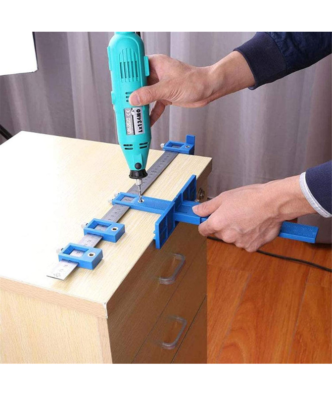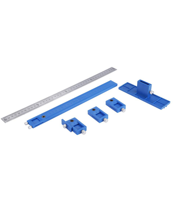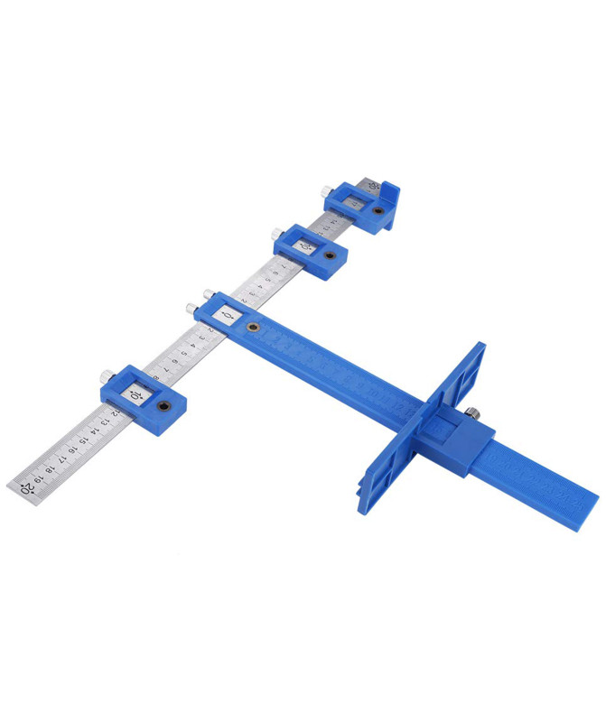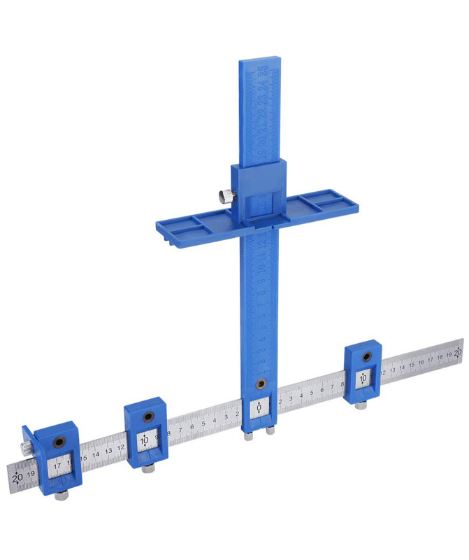 Szablon, prowadnica do wyznaczania punktów wiercenia. Główna szyna z naniesioną miarą umożliwia regulację znaczenia do 25 cm w głąb frontu mebla. W górnej części zamontowana jest ruchoma, stalowa listwa na której umieszczono trzy przesuwane znaczniki służące do dokładanego wyznaczenia punktów wiercenia. Po ustawieniu odległości należy dokręcić śrubę zaciskową powodując utrwaleniu ustawienia. Szablon ułatwia trasowanie na różnych materiałach np. drewnie , metalu , tworzywach sztucznych itp. Zacisk zainstalowany na lewym końcu wyposażony został w ogranicznik który po ustawieniu go w pozycji prostopadłej ustabilizuje narzędzie w pozycji poziomej lub pionowej. Każdy zacisk wyposażony został w śrubę dociskową dzięki czemu ustawiony wymiar możemy ponownie wykorzystać na kolejnym froncie/elemencie. Szyna wykonana jest ze stali nierdzewnej i aluminium, a elementy nastawcze z wysokiej jakości tworzywa. Cały zestaw zapakowano w praktyczne etui. Szablon przeznaczony jest do precyzyjnego wyznaczania punktów w których będziemy wiercić otwory. Równocześnie możemy wyznaczyć cztery otwory w różnych odległościach od siebie i blokując ustawienia dokonać zaznaczenia pod otwory w następnym froncie.