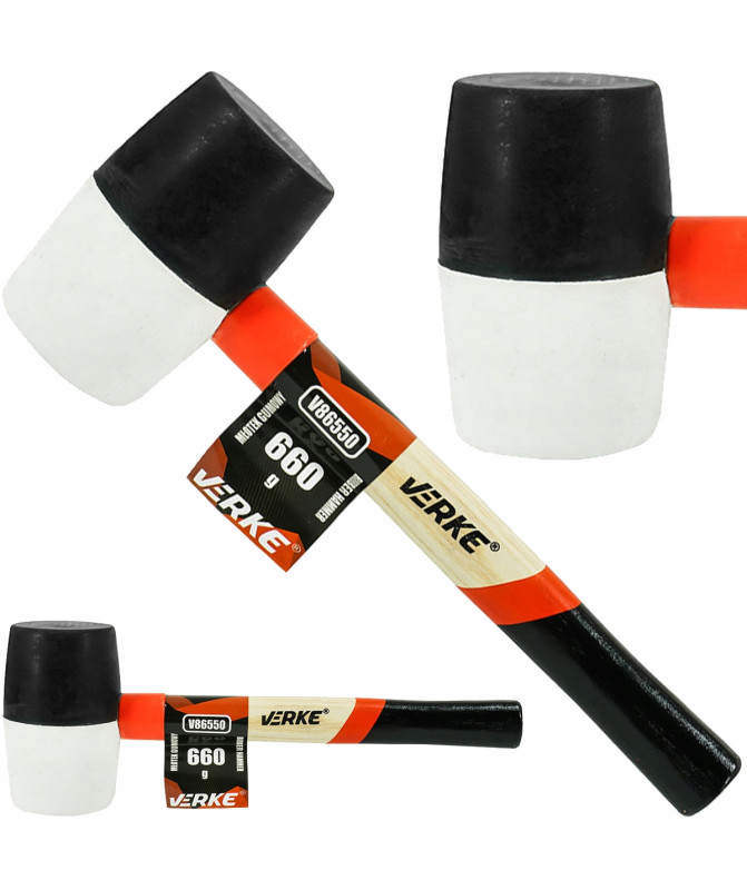 Obuch okrągły wykonany w połowie z czarnej i białej gumy (użyte gumy o różnych twardościach). Osadzony na drewnianym, lakierowanym trzonku. Młotek gumowy do prac montażowych w wielu branżach. Szczególnie przydatny przy układaniu glazury, montażach mebli i innych pracach z delikatnymi materiałami. Biała guma nie pozostawia śladów na materiale. Odporny na wpływ wilgoci. Waga 660 gram.