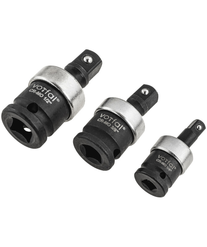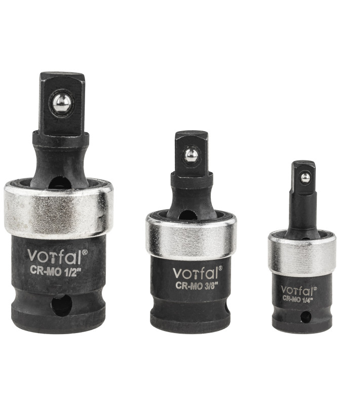 Zestaw przegubów Cardana udarowych kulistych. Przeguby są przydatne wszędzie tam, gdzie dostęp konwencjonalnymi narzędziami jest utrudniony lub niemożliwy. Przeznaczone do stosowania z narzędziami udarowymi. Wykonane z stali chromowo-molibdenowej.