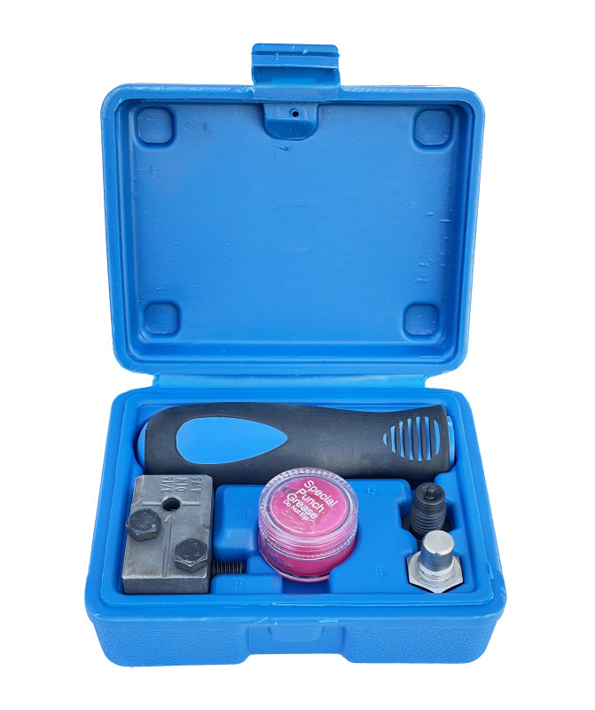 Zestaw do zarabiania przewodów hamulcowych dedykowany warsztatom samochodowym, motoryzacyjnym i serwisom naprawczym. Przyrząd przeznaczony do ręcznego rozszerzania i kielichowania przewodów i rurek miedzianych, do zarabiania końcówek hamulcowych, mechanizmów hydraulicznych uruchamiających sprzęgło. Przyrząd do końcówek przewodów wykonanych z miedzi oraz aluMinium. Zarabiarka do przewodów hamulcowych wykonana z materiałów najwyższej jakości, odporna na pękanie, na uszkodzenia mechaniczne. W zestawie mocny uchwyt do przewodów hamulcowych oraz zestaw ścisków. Całość zestawy umieszczona w poręcznej, ułatwiającej transport i przechowywanie walizce. Do przewodów o średnicy 3/16"; 4,75mm Wykonuje końcówki typu SAE OP1 (stożek SF europejski) OP2 (lejek DF azjatycki).