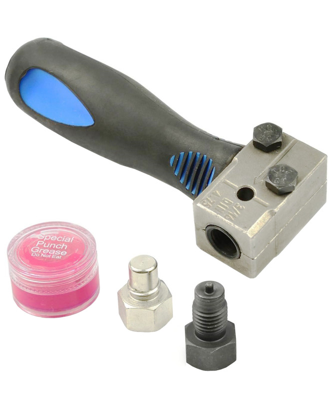- Usuń stempel OP1, odwróć i włóż koniec stempla OP2. Całkowicie dokręć, tak aby sześciokąt stempla przylegał płasko do narzędzia.
