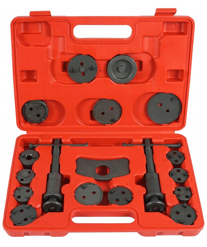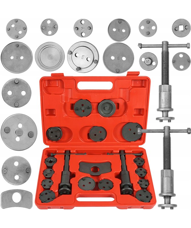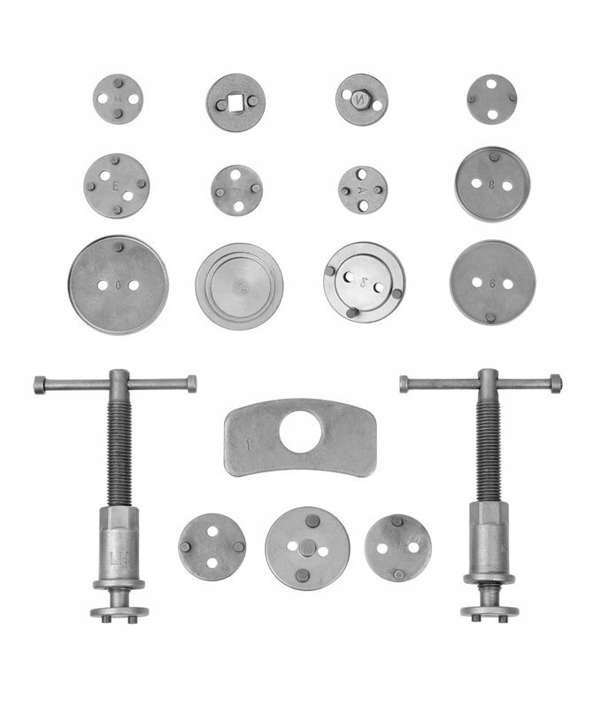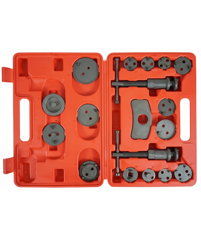 Profesjonalny 18 elementowy zestaw do cofania / wciskania tłoczków w cylinderkach układów hamulcowych, niezbędny przy naprawach pojazdów wyposażonych w hamulce tarczowe. Pokrętło wyposażone jest w magnetyczną końcówkę, dzięki temu utrzymuje talerzyk odpowiadający danemu tłoczkowi w osi. Zestaw przeznaczony jest dla każdego warsztatu samochodowego, gdzie pomaga przyspieszyć serwisowanie układów hamulcowych.