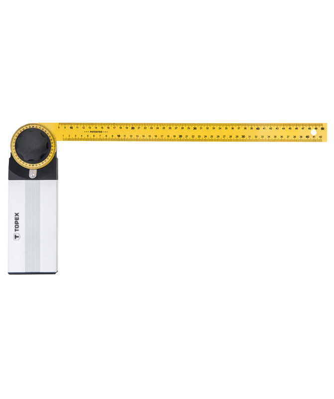 Kątomierz nastawny TOPEX (nr ref. 30C345) o wymiarach 500 x 240 mm. Aluminiowy uchwyt jest poręczny, dzięki czemu regulacja kąta nie wymaga wysiłku. Blokada ustawienia kąta ułatwia dokonanie pomiaru. Marka TOPEX skierowana jest do majsterkowiczów.