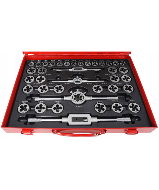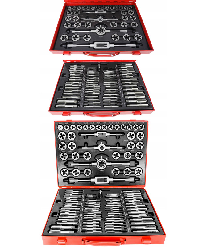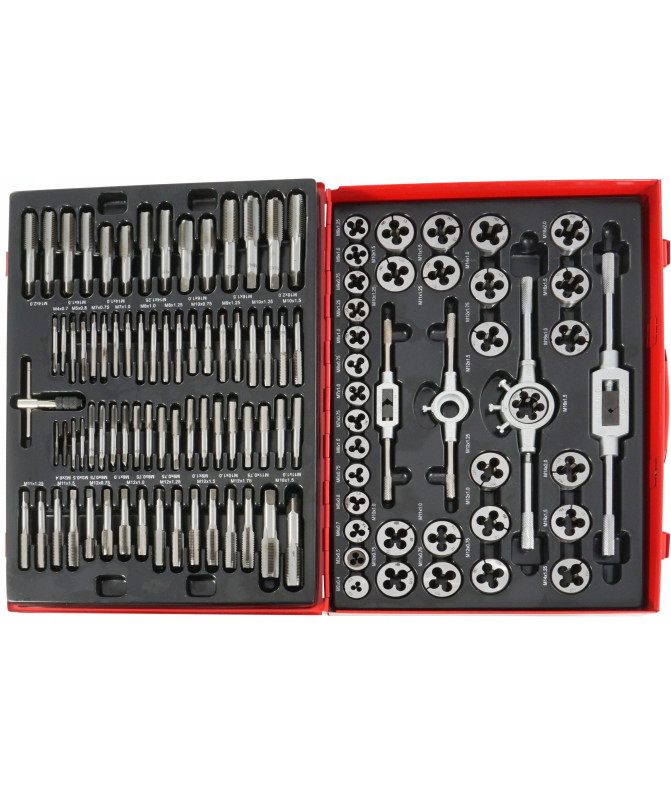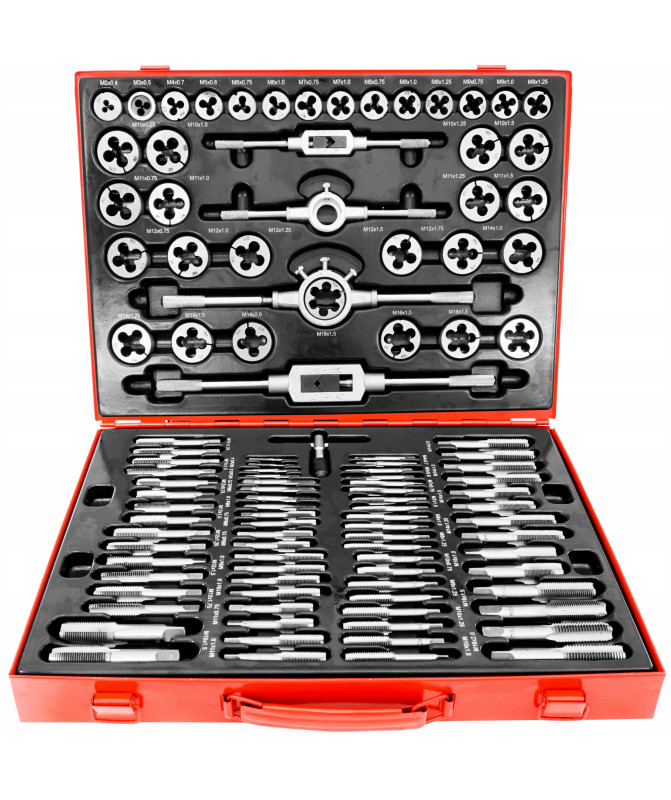 Profesjonalne gwintowniki i narzynki wykonane z doskonałego materiału. Zestaw zawiera 110 elementów. Zapakowany w wygodną walizkę, która pozawala utrzymać porządek, łatwo transportować zestaw i błyskawicznie odnaleźć potrzebny w danej chwili element. Zestaw służy do naprawy połączeń gwintowych różnego kalibru.