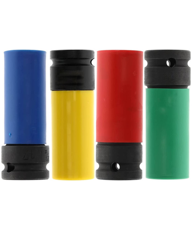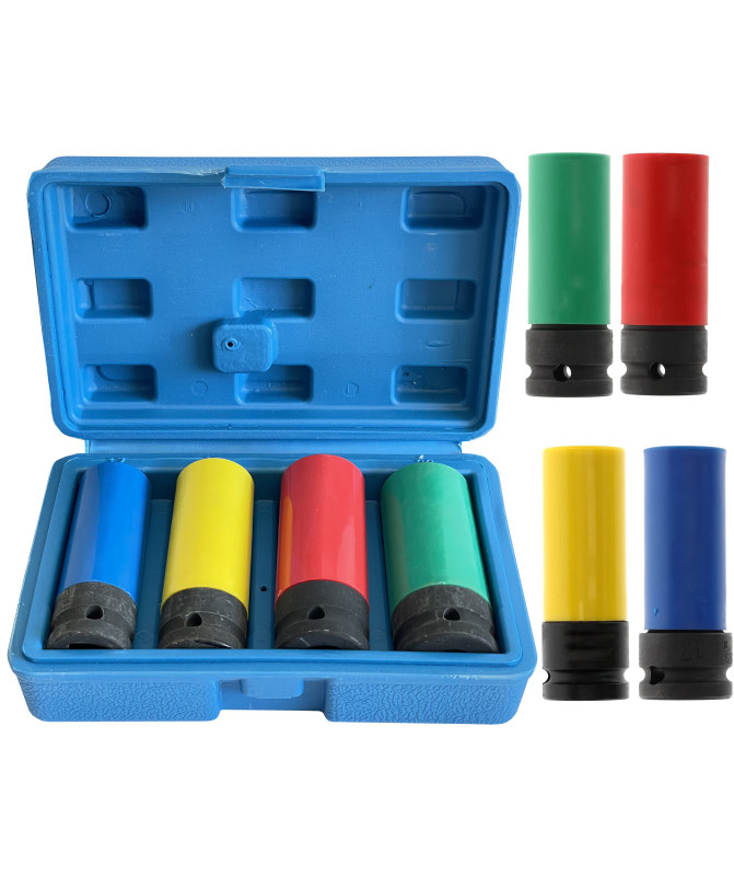 Umożliwia pracę: zakręcanie, dokręcanie, odkręcania nakrętek, śrub z odpowiednio dużą siłą. Długie nasadki umożliwiają dostęp do głębokich gniazd śrub. Wykonane z wytrzymałej stali, zabezpieczone przed korozją. Nasadki mają zabezpieczenie przed niepożądanym zsunięciem się trzpienia z gniazda (wyżłobienie pod kulkę). Nasadki posiadają zabezpieczenie w postaci otuliny aby nie uszkodzić felg. W zestawie z praktyczną walizką.