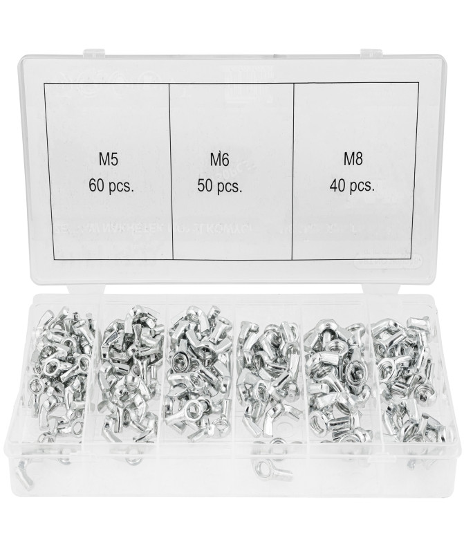 Zestaw składa się z 150 sztuk nakrętek metrycznych motylkowych. Nakrętki umieszczone są w wygodnym opakowaniu typu "sortownik".