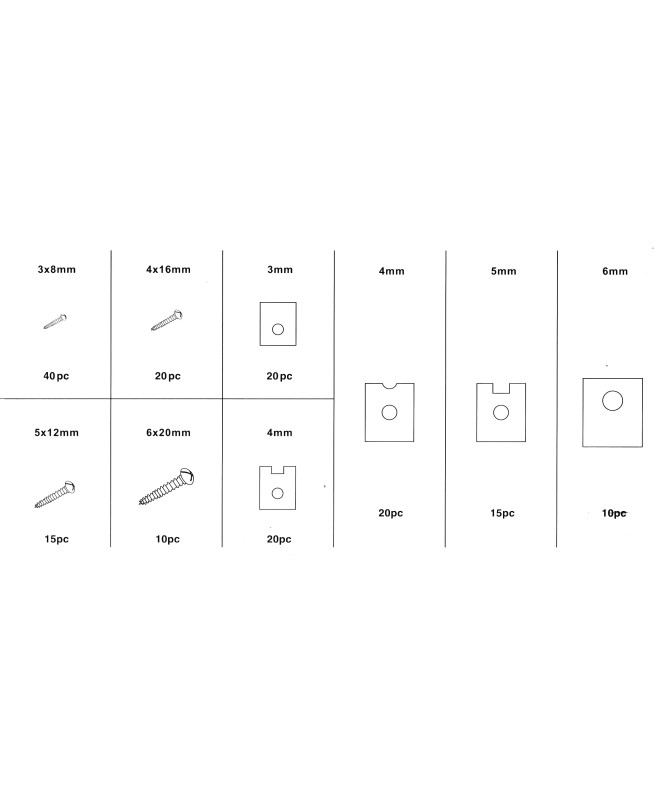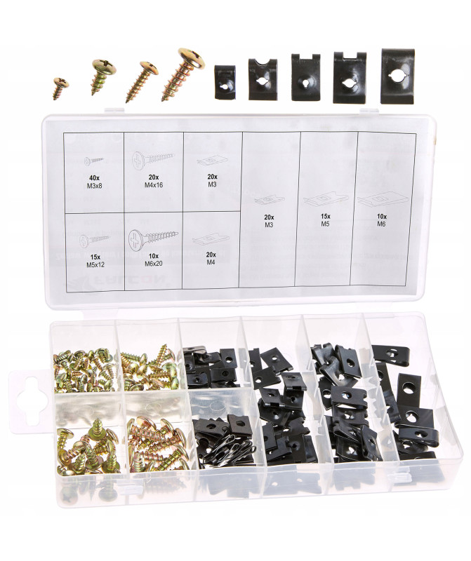 Zestaw składa się z 150 sztuk wkrętów i podkładek do karoserii, o rozmiarach od M3x8 mm do M6x20 mm. Wkręty i podkładki umieszczone są w wygodnym sortowniku.