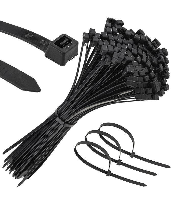 Opaski zaciskowe 7.6 x 350 mm, w kolorze czarnym, pakowane po 100 szt. Przeznaczone są do łączenia wiązek kabli elektrycznych, przewodów, rurek, węży lub też do szybkich doraźnych naprawach. Proste w montażu. Posiadają dużą odporność na zrywanie. Dostępne są w wielu rozmiarach oraz kolorach. Gęste ząbki na całej długości pozwalają na precyzyjne dopasowanie pętli opaski do rozmiaru wiązki. Opaski możemy zaciskać ręcznie lub za pomocą specjalnego przyrządu.