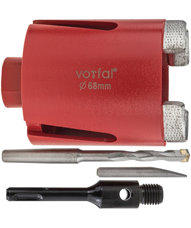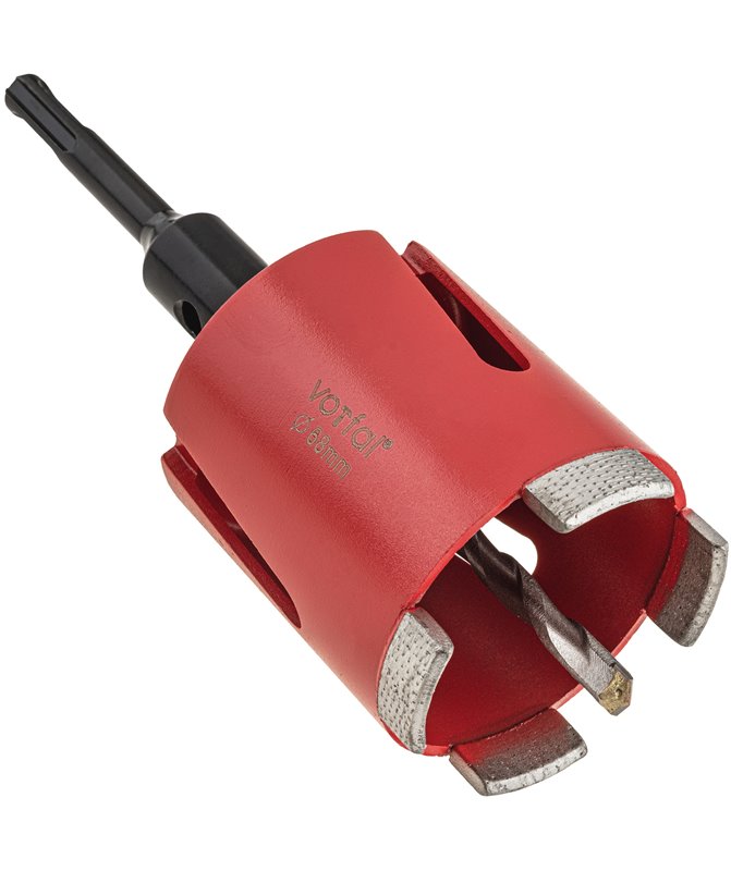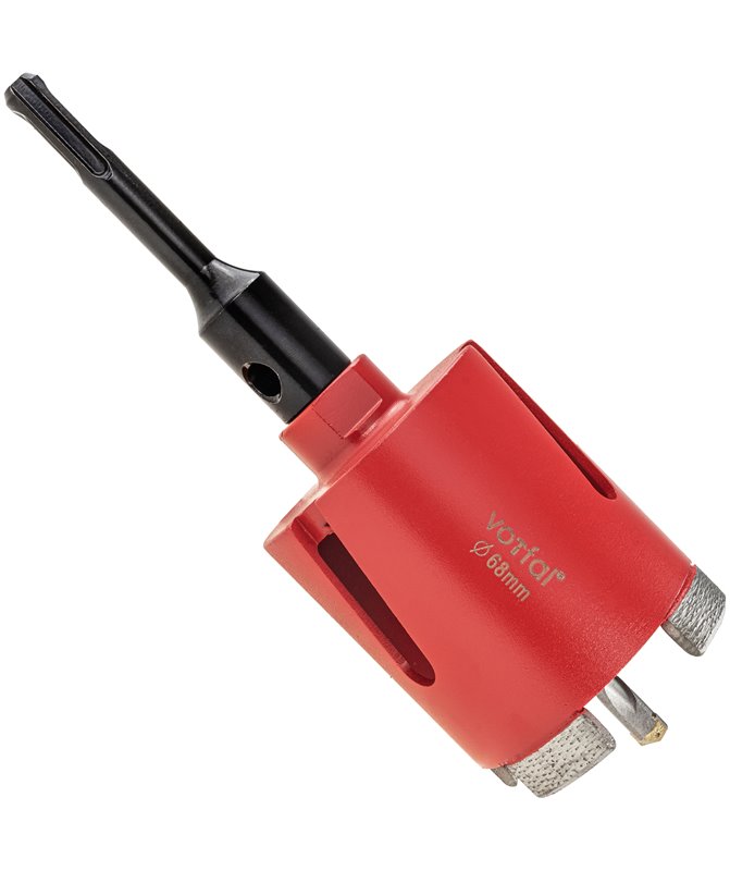 SEGMENT z rzędowo rozmieszczonymi diamentami gwarantuje efektywne wiercenie również w mocno zbrojonym betonie (pręty do fi12mm). 4 segmenty to duża prędkość wiercenia i dłuższa żywotność w najtwardszych materiałach w porównaniu ze standardowymi otwornicami. Wysoki komfort pracy, ponieważ wiertło diamentowe do betonu wymaga znacznie mniejszej siły docisku niż większość produktów dostępnych na rynku. Otwornica ze szczelinami bocznymi, do otworów pod puszki, może być używane bez odkurzacza. Wiercenie BEZ UDARU z ręki dzięki zastosowaniu adaptera SDS+.