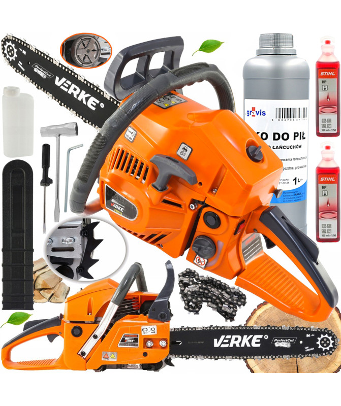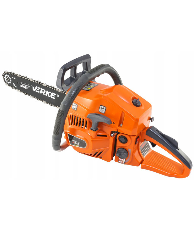 Pilarka spalinowa VERKE CS58-T, z dwusuwowym silnikiem o mocy 3 KM i pojemnością 55 cm³. Idealnie sprawdzi się podczas cięcia zarówno drzewa opałowego, małych i średnich drzew oraz prac budowlanych.