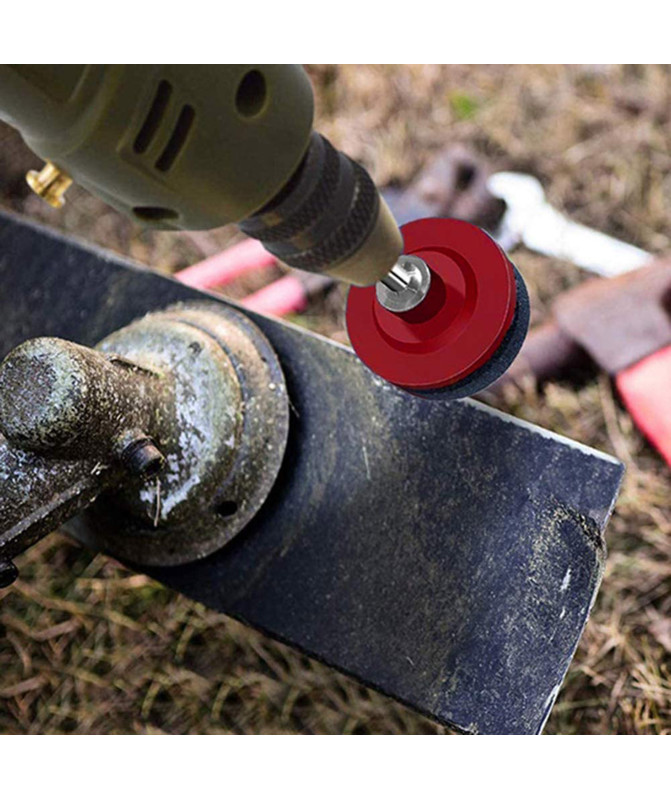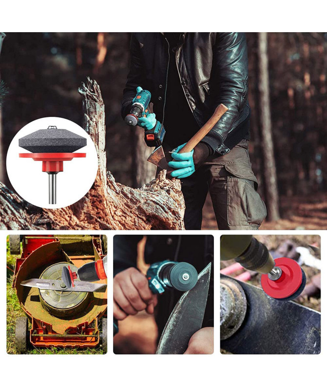 Ostrzałka do wszelkiego rodzaju ostrzy, noży, kosiarek, sekatorów, pił, kos, nożyc. Wyposażona w trzpień - 6 mm pasujący praktycznie do wszystkich wiertarek, wkrętarek lub miniszlifierek.
