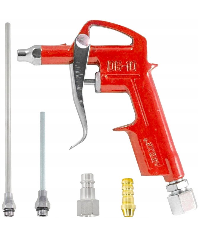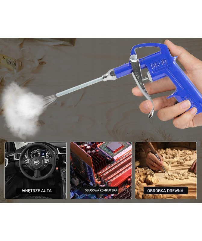 Pistolet do przedmuchiwania służy do oczyszczania strumieniem sprężonego powietrza zabrudzonych powierzchni. Dzięki długiej dyszy możliwa jest praca pistoletem w miejsca trudno dostępnych.