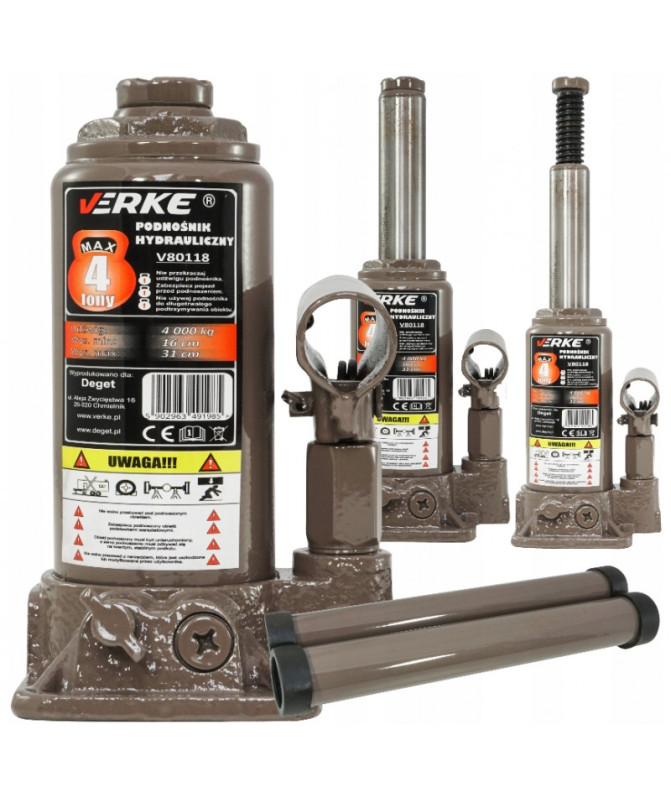 Podnośnik hydrauliczny słupkowy marki Verke o maksymalnym ciężarze podnoszenia 4t. Jego solidna konstrukcja zapewnia trwałość i bezpieczeństwo, a małe gabaryty gwarantują łatwość w użytkowaniu i niezawodność każdemu mechanikowi. Dodatkowo wykręcana stopa w tłoku podnośnika posiada silny trapezowy gwint, odporny na przeciążenie i gwarantujący płynną pracę. Znajdzie on zastosowanie w każdym warsztacie, a także stanowi znakomite uzupełnienie wyposażenia garażu.