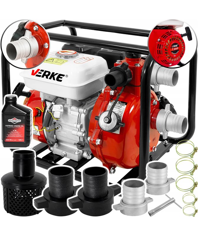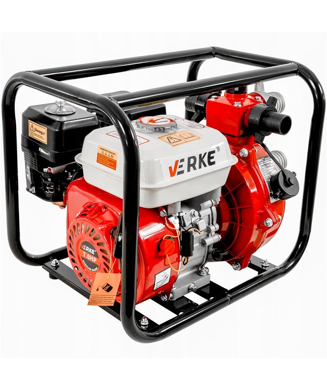 Wydajna pompa ciśnieniowa marki Verke została zabudowana w stalowej ramie chroniącej ją przed uszkodzeniem, oraz ułatwiającej transport. Świetnie sprawdza się przy nawadnianiu, w czasie suszy i przy wszelkich pracach wymagających przepompowania wody. Wyposażona została w mocy silnik czterosuwowy o mocy 7 KM. Motopompa charakteryzuje się wysokim ciśnieniem 7 bar.