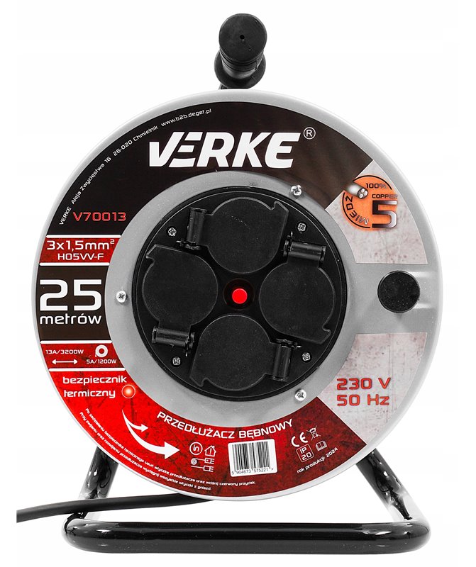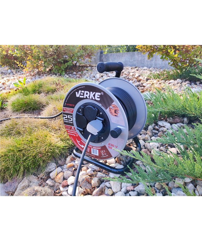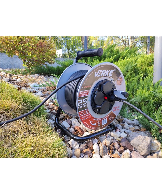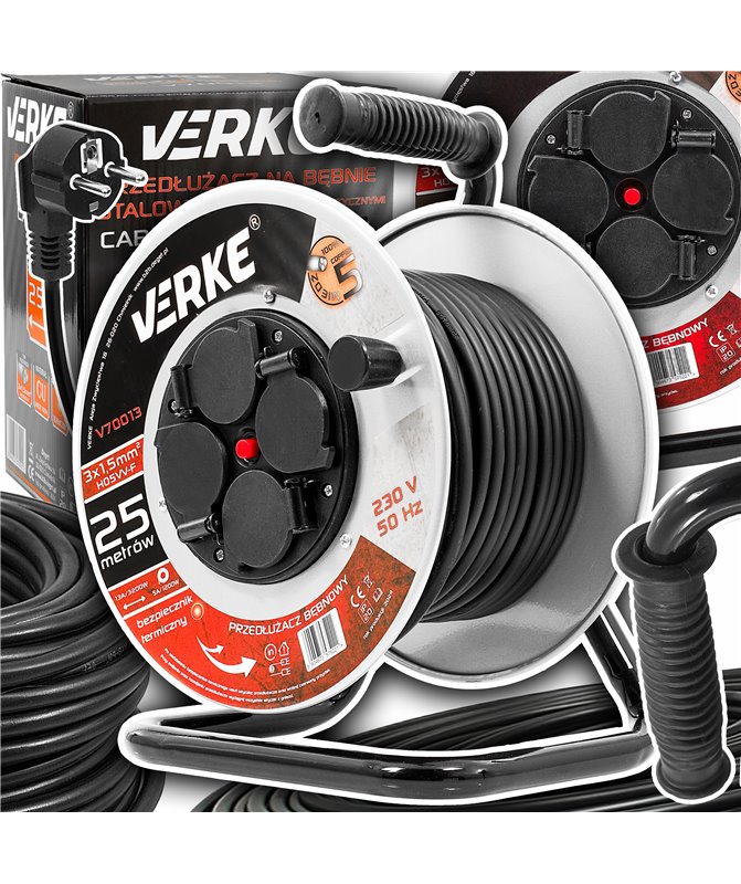 Przedłużacz 3x1,5 mm, 25 m na bębnie stalowym, gniazda hermetyczne Verke