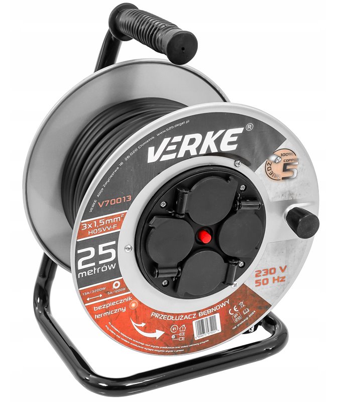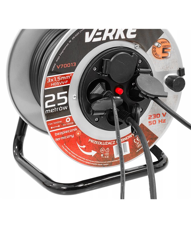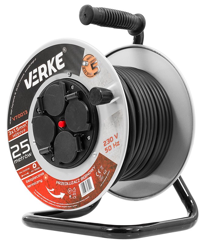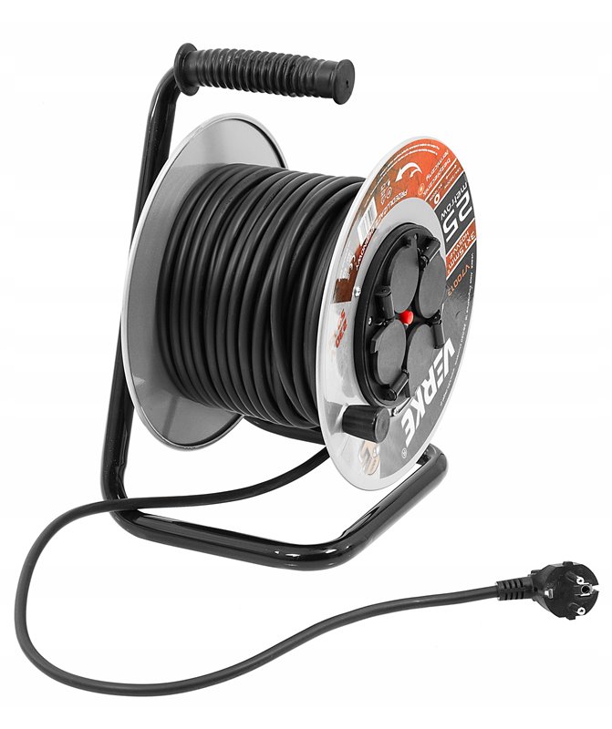 Wysokiej klasy przedłużacz bębnowy o długości 25 m z 4 gniazdami. Przewód wykonany jest z 3 żył miedzianych o przekroju 1,5 mm² każdy. Taki przekrój przewodu umożliwia podłączenie do tych przedłużaczy jednocześnie 4 urządzeń, co jest szczególnie przydatne na budowie czy w warsztacie. Przewody pokryte są izolacją z polwinitu, która charakteryzuje się wysoką odpornością na uszkodzenia mechaniczne, czynniki atmosferyczne, substancje chemiczne. Przedłużacz został wyposażony w bezpiecznik termiczny.