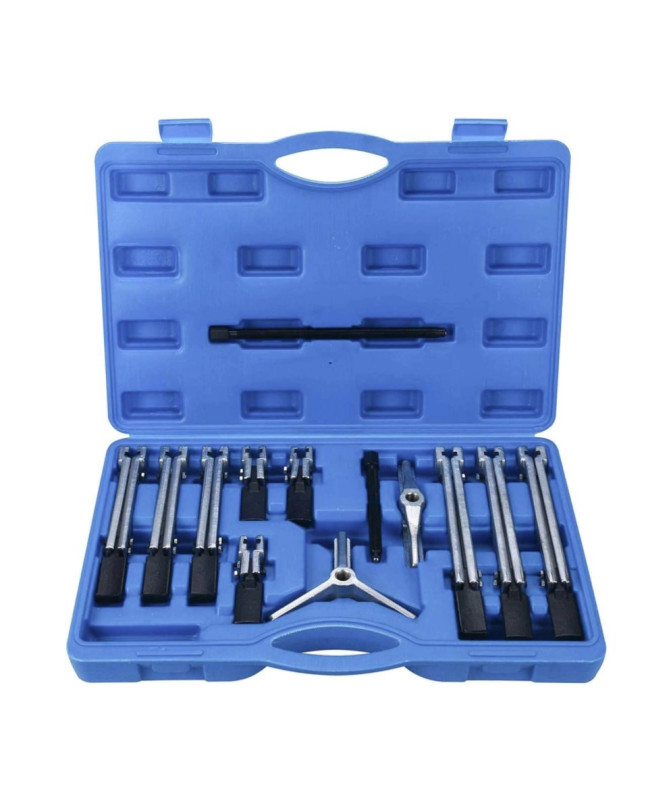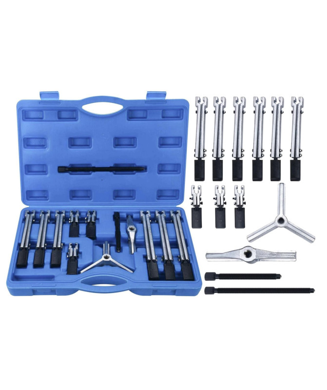 Ściągacz do łożysk dwu i trójramienny to profesjonalny zestaw narzędzi, który umożliwia łatwe i bezpieczne ściąganie dużych łożysk, kół pasowych oraz kół zębatych. Zestaw składa się z różnych elementów, które pozwalają zmontować ściągacze o różnych długościach ramion oraz w wersjach wewnętrznej i zewnętrznej.
