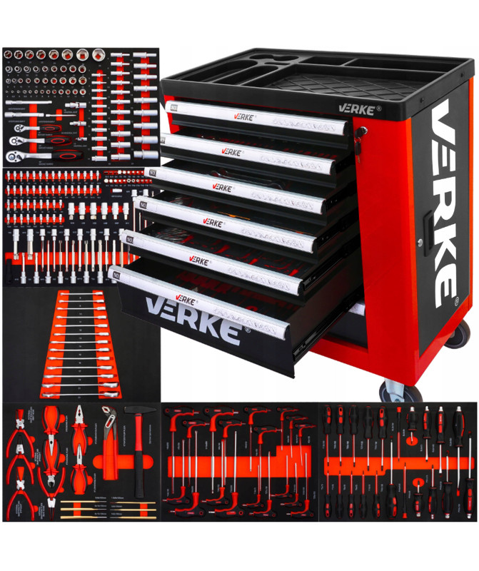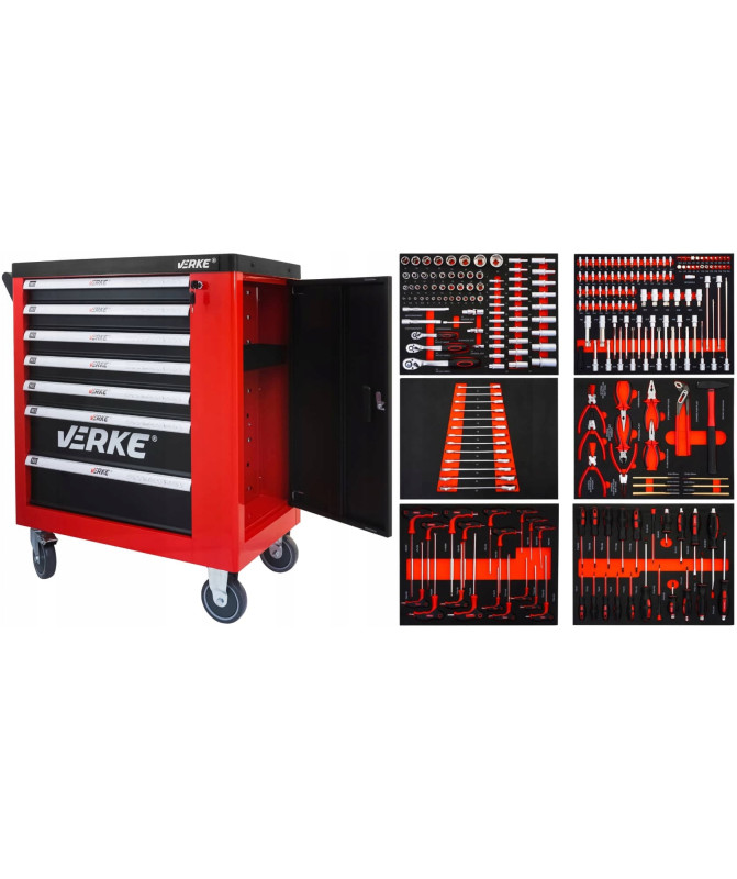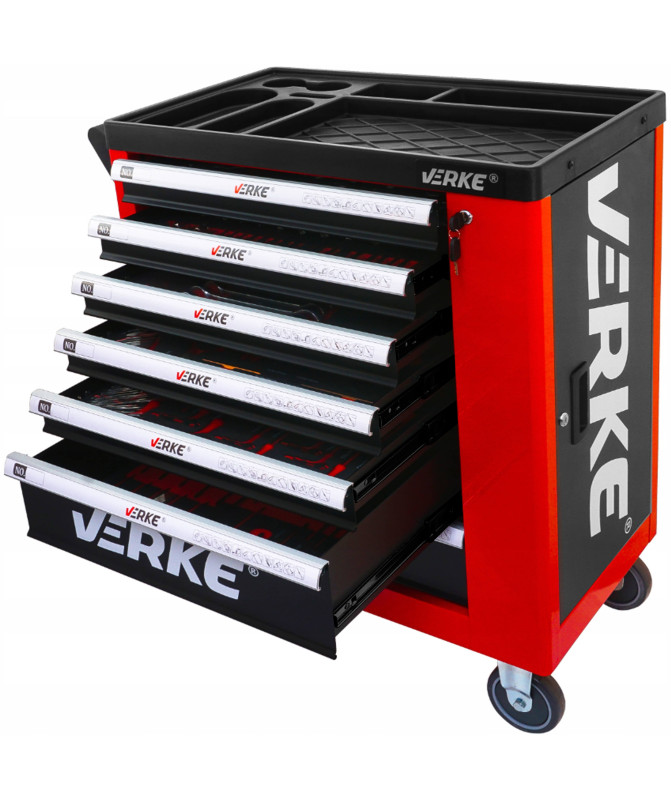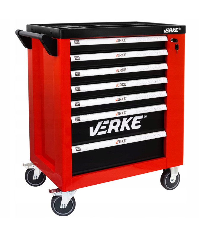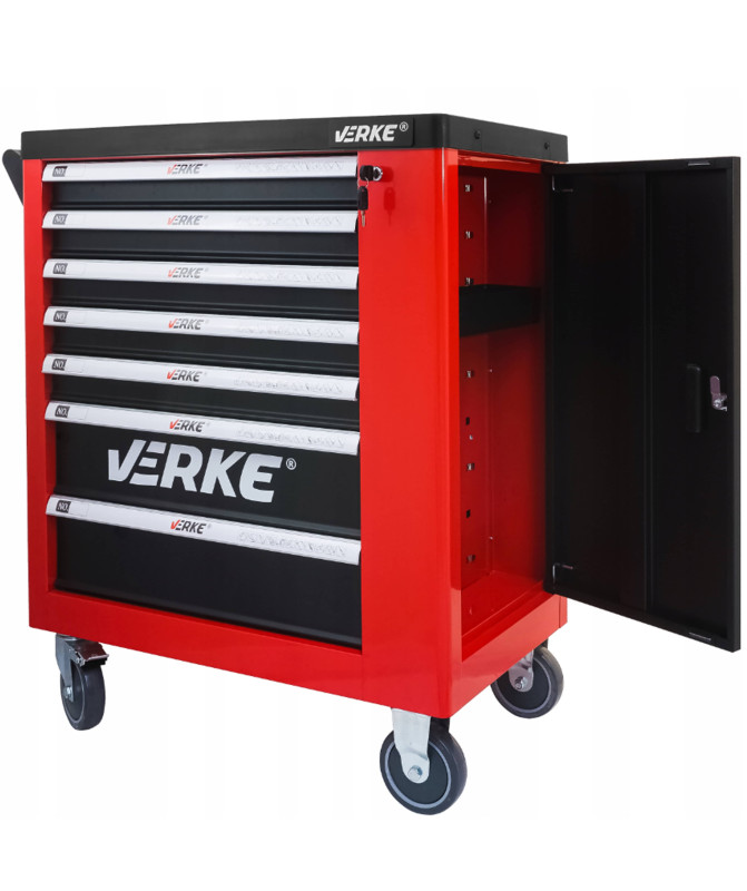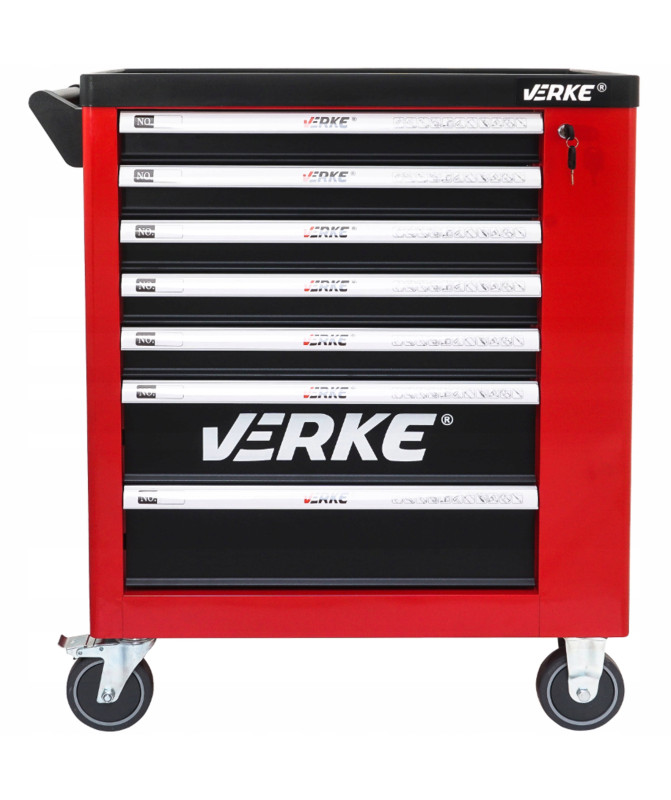Szafka narzędziowa Verke posiada 7 praktycznych szuflad na narzędzia plus szafkę boczną zamykaną za pomocą zamka centralnego. Wszystkie szuflady są w pełni otwierane, posiadają prowadnice kulkowe, zapewniające długoletnie, płynne i niezawodne działanie. Szuflady zabezpieczone są blokadą zapadkową, która zapewnia ochronę otoczenia w czasie transportu. Powierzchnia blatu roboczego odporna jest na działanie oleju i smarów. Pięciocalowe, ciche, skrętne koła ułatwiają manewrowanie szafką dodatkowo wyposażone są w hamulec. Szafka wyposażona jest w uchwyt, który ułatwia prowadzenie.