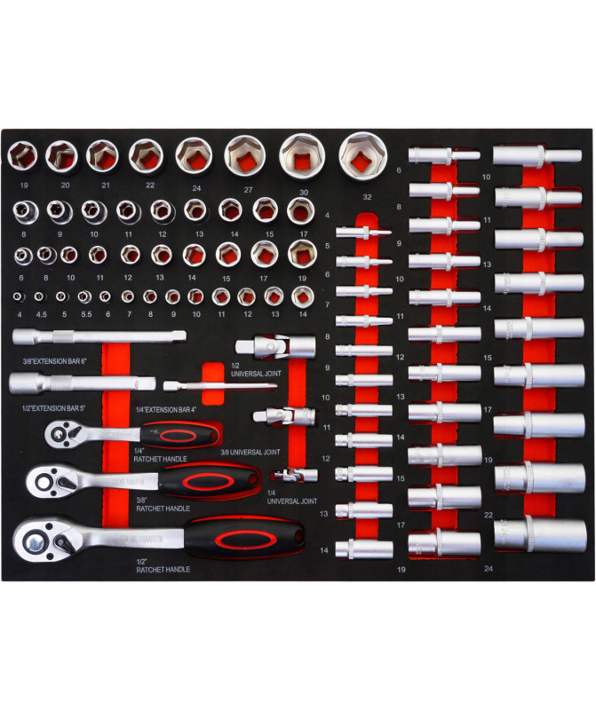 - nasadki 1/2" krótkie: 8, 9, 10, 11, 12, 13, 14, 15, 17, 19, 20, 21, 22, 24, 27, 30, 32 mm