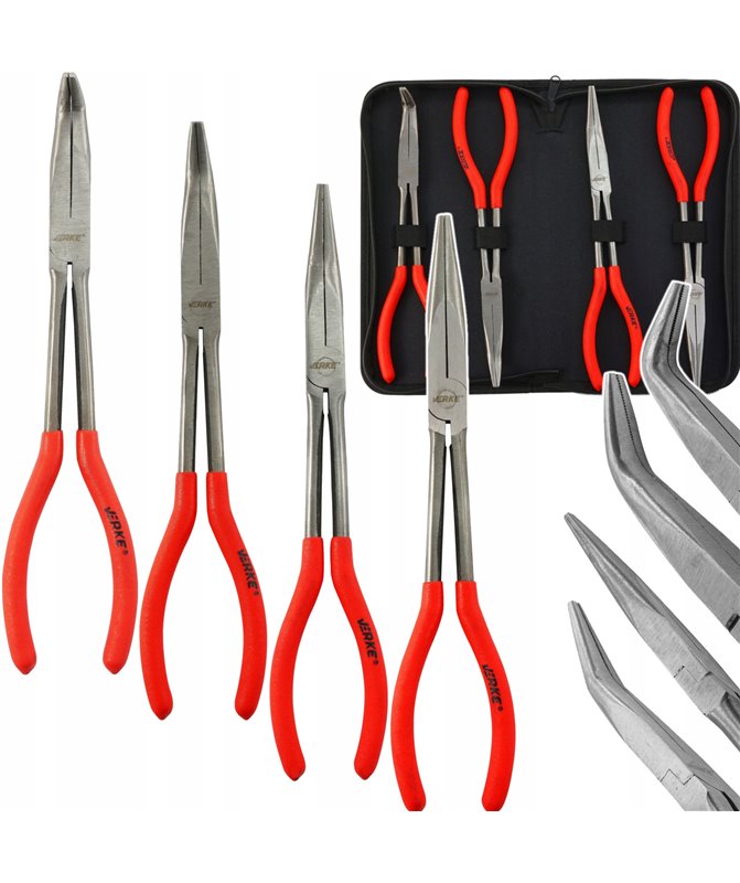 Profesjonalny zestaw szczypiec 11", 280mm. Szczypce wydłużone, proste oraz gięte uniwersalne do chwytania przedmiotów płaskich i okrągłych, wykonane z wysokogatunkowej stali chromowo-wanadowej, mają wszechstronne zastosowanie zarówno w przemyśle jak i serwisach czy warsztatach. Rękojeści osłonięte miękkimi nakładkami z tworzywa. Całość zapakowana w praktyczny zasuwany pokrowiec.