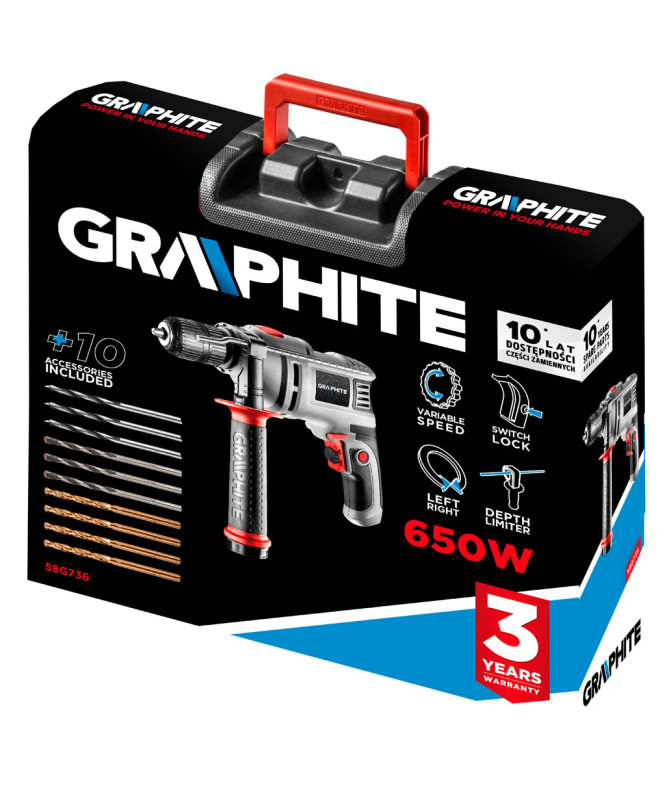 Wiertarka udarowa 650W, uchwyt samozaciskowy 13 mm, obroty 0-3000 min⁻¹, walizka + 10 wierteł