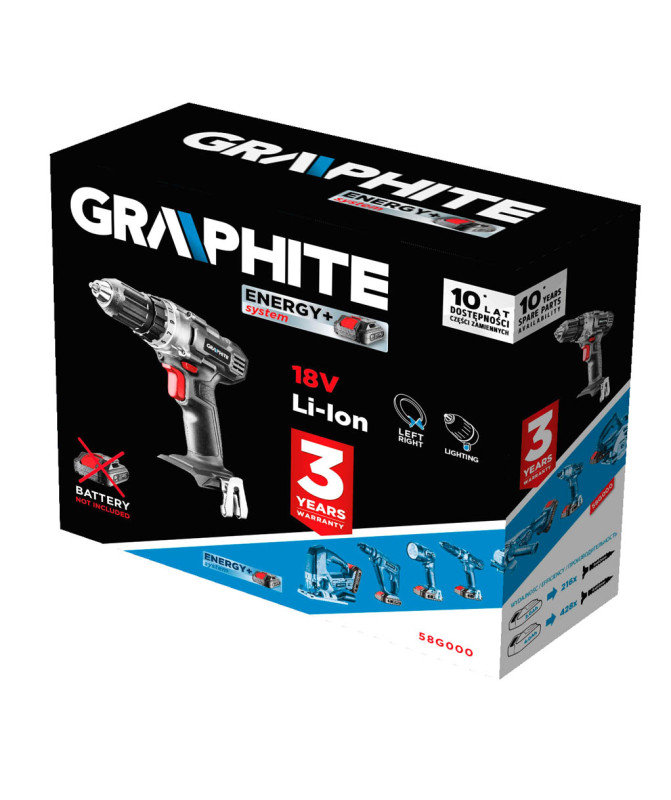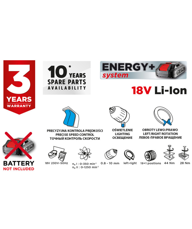 Wiertarko-wkrętarka akumulatorowa Energy+ 18V, Li-Ion, uchwyt samozaciskowy 10 mm, bez akumulatora
