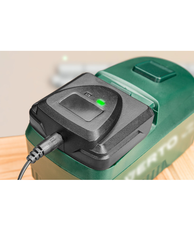 Wiertarko-wkrętarka akumulatorowa VERTO (nr ref. 50G185) wyposażona w wydajny akumulator Ni-Zn o napięciu 14.4V i pojemności 1.5Ah. Zakres obrotów wynosi 0-550 obr./min. 20-stopniowa regulacja momentu obrotowego pozwala precyzyjnie dostosować siłę dokręcania, a także skorzystać z funkcji wiercenia. Maksymalny moment obrotowy wynosi 15 Nm. Ogniwa zostały wykonane w technologii Ni-Zn, dzięki czemu są ekologiczne (nie zawierają szkodliwego kadmu), charakteryzują się większą mocą i są lżejsze od ogniw Ni-Cd, a także można je doładowywać w dowolnym momencie (brak efektu pamięci). Korpus wkrętarki wykonany jest z odpornego na uszkodzenia tworzywa. Wkomponowane w rękojeść miękkie wkładki poprawiają komfort pracy. W konstrukcji zastosowano elektryczny hamulec wrzeciona dla większej precyzji i bezpieczeństwa pracy. Wbudowana dioda LED umożliwia podświetlenie miejsca pracy. W zestawie z urządzeniem znajduje się 6 wierteł, 6 bitów, uchwyt do bitów oraz drugi akumulator. Zgodność z europejskimi standardami bezpieczeństwa zapewnia certyfikat CE. Marka VERTO oferuje asortyment elektronarzędzi i akcesoriów dla każdego majsterkowicza.