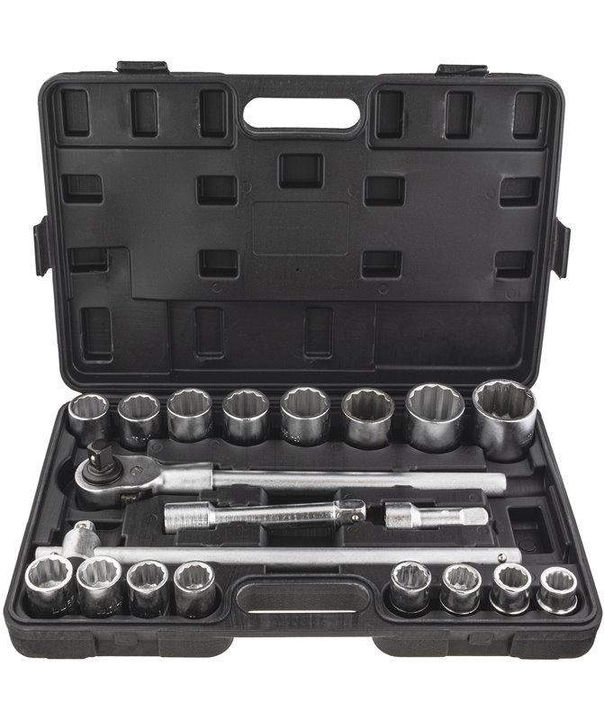 Profesjonalny zestaw składa się z 21 el. 12-kątnych wykonany z kutej wysokiej jakości stali CRV (chromowo-wanadowej). Niezbędny w każdym warsztacie samochodowym, nasadki tej wielkości pomogą przy naprawie ciężarówek czy maszyn rolniczych. Idealne przy odkręcaniu lub dokręcaniu dużych śrub. Nasadki wykonane ze stali chromowo-wanadowej z wysoką zawartością związków węgla dla zachowania wysokiej twardości w całym przekroju. Gniazdo każdej nasadki jest wykonane z dużą precyzja zgodnie z najbardziej wyśrubowanymi normami UE. Oferowany przez nas zestaw posiada klucze nasadowe wraz z wysokiej klasy grzechotką i przedłużkami, wykonane z kutej wysokiej jakości stali CRV (w praktycznej, plastikowej walizce umożliwiającej bezproblemowy transport. Nasadki oraz końcówki przedłużek są na 3/4".