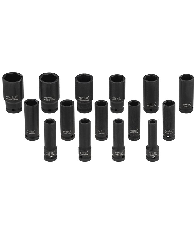- W zestawie klucze nasadowe w rozmiarach: 10, 12, 13, 14, 15, 16, 17, 18, 19, 21, 22, 24, 27, 30, 32 mm